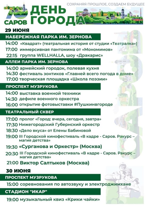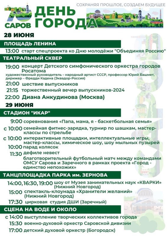 28, 29 и 30 июня в Сарове запланирована серия событий, посвященная выпускному, Дню города и Дню молодежи. Мероприятия пройдут на нескольких площадках.В пяницу, 28 июня, на Театральной площади пройдет концерт Детского симфонического оркестра городов Росатома под художественным руководством Юрия Башмета. На выпускном для саровчан выступит Диана Анкудинова: https://mail.sarov24.ru/kultura/17816-diana-ankudinova-vystupit-na-vypusknom-v-sarove.htmlВ субботу, 29 июня, с 11 часов и до позднего вечера мероприятия пройдут на набережной и в парке имени Зернова, на проспекте Музрукова и в Театральном сквере.В программе – шоу от нижегородскоого Музея занимательтных наук «Кварки», спектакль-клоунада «Хранители желаний» от «Мономимов»: https://mail.sarov24.ru/kultura/17827-mimy-budut-razvlekat-sarovchan-na-den-goroda.htmlТакже перед горожанами выступят гости из Заречного, Богородска и саровские коллективы «Зебра», «Сказ», «Стелла», военно-духовой оркестр, «Театралка»,WELLHALLA.На главной сцене пройдут концерты Нижегородского губернского оркестра, Виктора Салтыкова и рок-группы «Сурганова и оркестр»: https://mail.sarov24.ru/kultura/17821-rok-gruppa-surganova-i-orkestr-vstupit-v-sarove-na-dne-goroda.htmlВ этот день развернется армейский городок, полевая кухня, выставка военной техники, будут работать фотозоны, творческие площадки, праздничная ярмарка и многое другое.В воскресенье, 30 июня, на стадионе «Икар» состоится музыкальный квиз «Крики чайки», на проспекте Музрукова – соревнования по автозвуку и электроджимхане.Источник: администрация Сарова