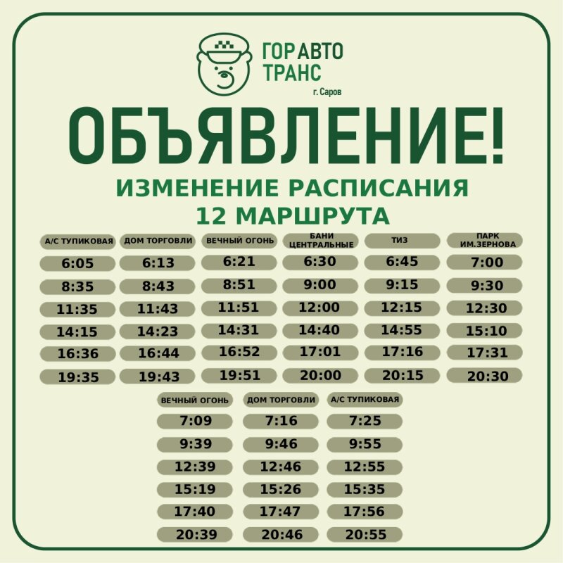 Летнее расписание муниципального маршрута регулярных перевозок № 12, размещенное на официальном сайте администрации Сарова, не изменилось: https://adm-sarov.nobl.ru/activity/51859/